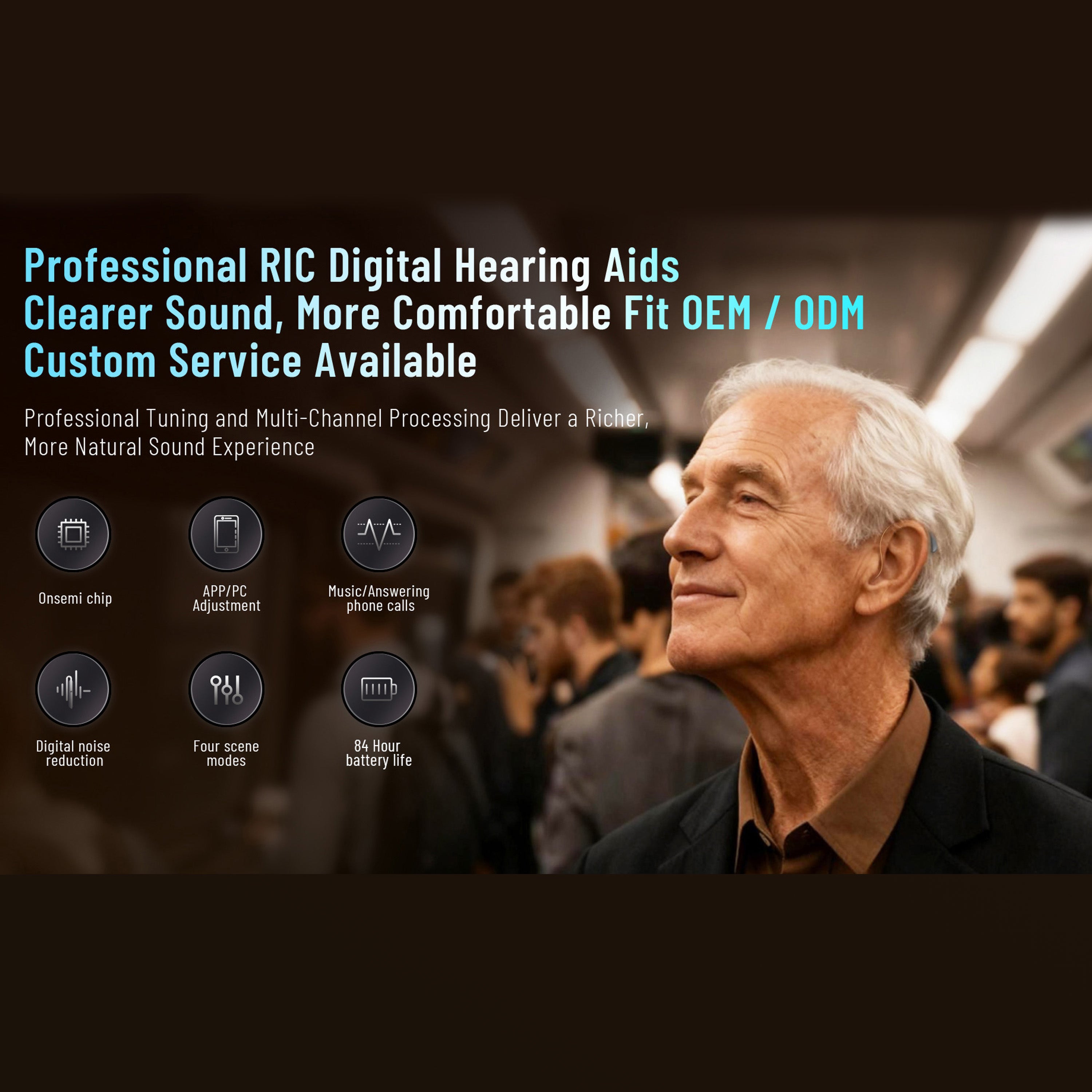 Professional RLC digital hearing aids for clearer sound and greater comfort. OEM/ODM customization services available. Professional tuning and multi-channel processing deliver a richer, more natural listening experience.