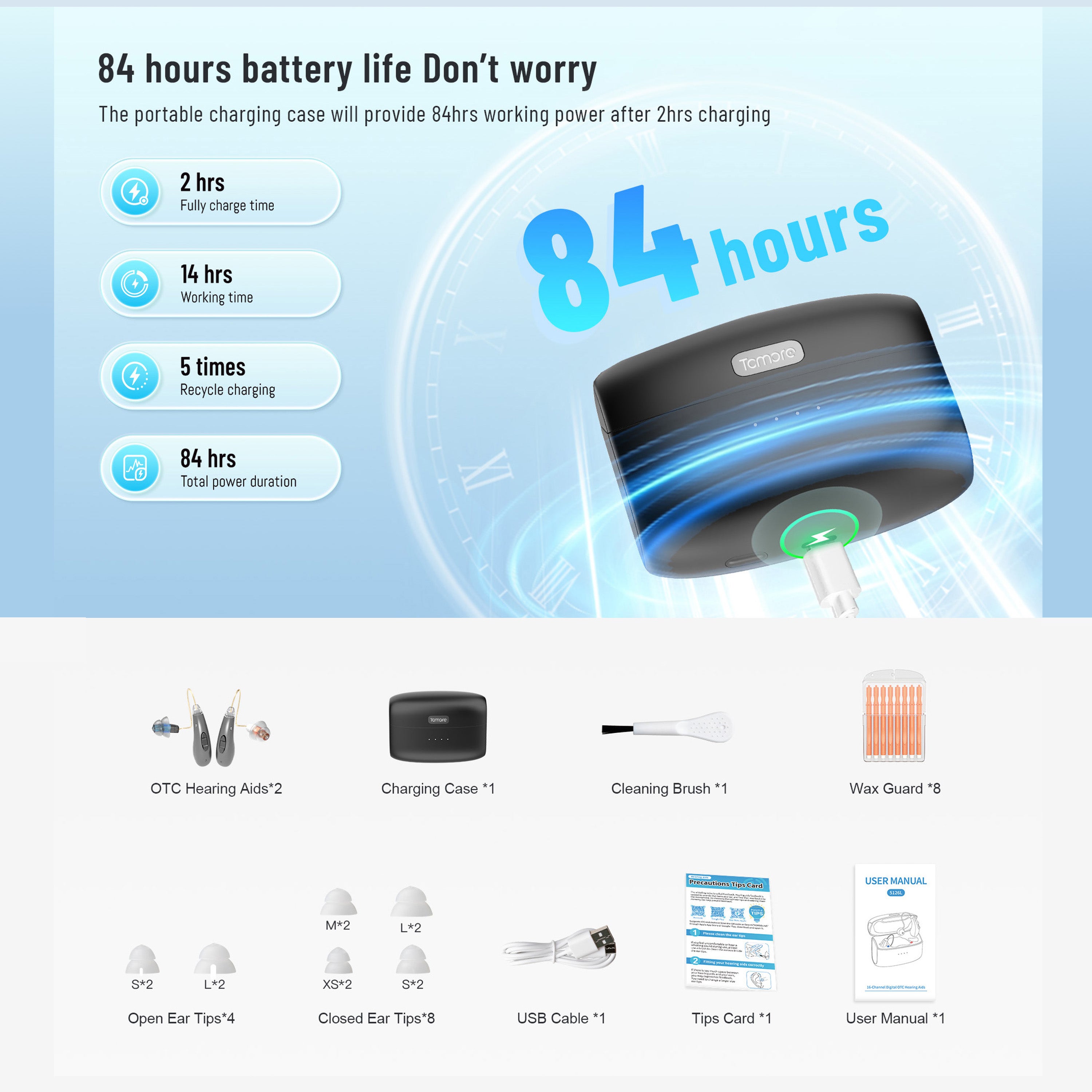 84-hour extended battery life: No need to worry, the portable charging case provides 84 hours of battery life with just 2 hours of charging. A full charge takes 2 hours, providing 14 hours of battery life. It can be recharged 5 times, each time for 8 hours, for a total battery life of 84 hours.